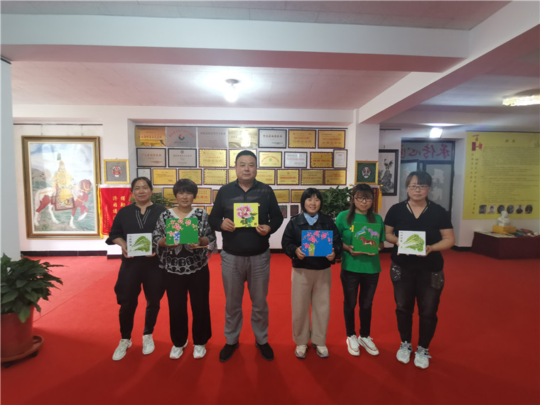 蘑菇峪扶贫生产车间贫困人员和郑铁军董事长在郑氏砂艺非遗展厅合影留念