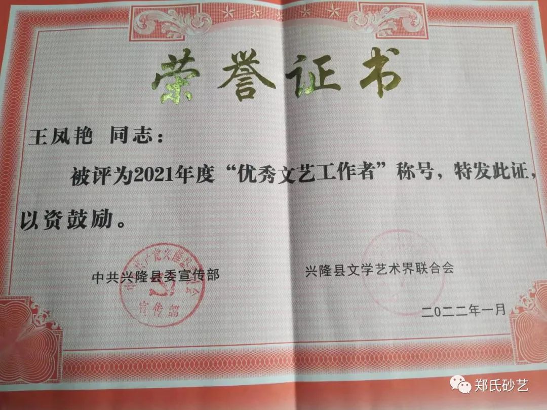 近日,县委宣传部、县文联发表了《关于表彰2021年度优秀文艺家协会、优秀村级文联、优秀企业文联、优秀文艺工作者的决定》,文中指出“2021年,在县委、县政政府的坚强领导下,在市文联的直接指导下,全县广大文艺工作者,深入学习贯彻党的十九大和习近平文艺座谈会上的讲话精神,在‘乡村振兴党旗红·文艺创新树先锋’和‘文艺名村’建设实践活动中,辛勤耕耘,积极创作,服务人民,为繁荣全县文艺事业做出了积极贡献,涌现出了一大批表现突出、成绩优异的文艺工作者。”在此次通报表彰中,郑氏砂艺董事长郑铁军、徐书英、王凤艳、赵文红、张国新、王建宝、张玉红、张秀荣、王婷共9人被县委宣传部和县文联授予2021年度“优秀文艺工作者”称号。企业将继续开拓创新,潜心创作,努力发掘出更多文艺人才,壮大郑氏砂艺艺术研究所,创作出更多文艺精品,为推进新时代兴隆县文艺事业繁荣发展作出新的更大贡献。
