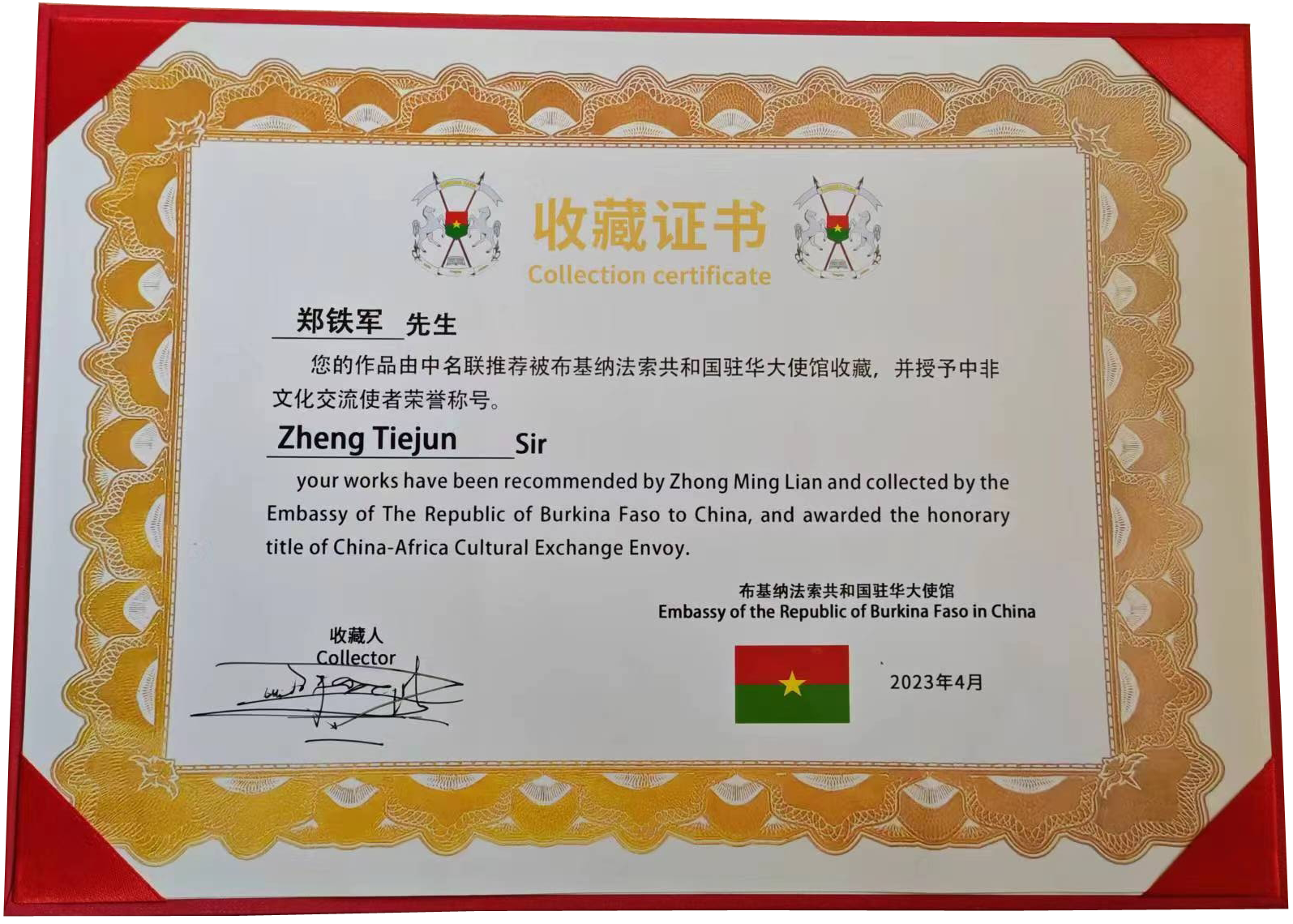 郑铁军先生的作品曾多次参加国内大型会展,并被多家展馆收藏。2023年4月,其作品再次被布基纳法索共和国驻华大使馆收藏并颁发证书,并被作为国礼收藏,为两国友好合作的美好愿望添砖加瓦。