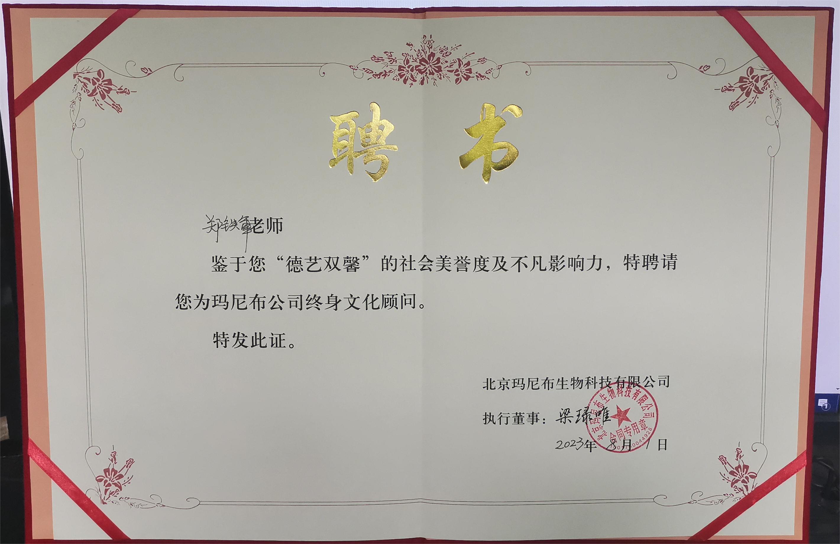 2023年8月1日,郑铁军老师砂画作品《牡丹》被北京玛尼布生物科技有限公司永久收藏,同时郑铁军老师被该公司聘为终身文化顾问。