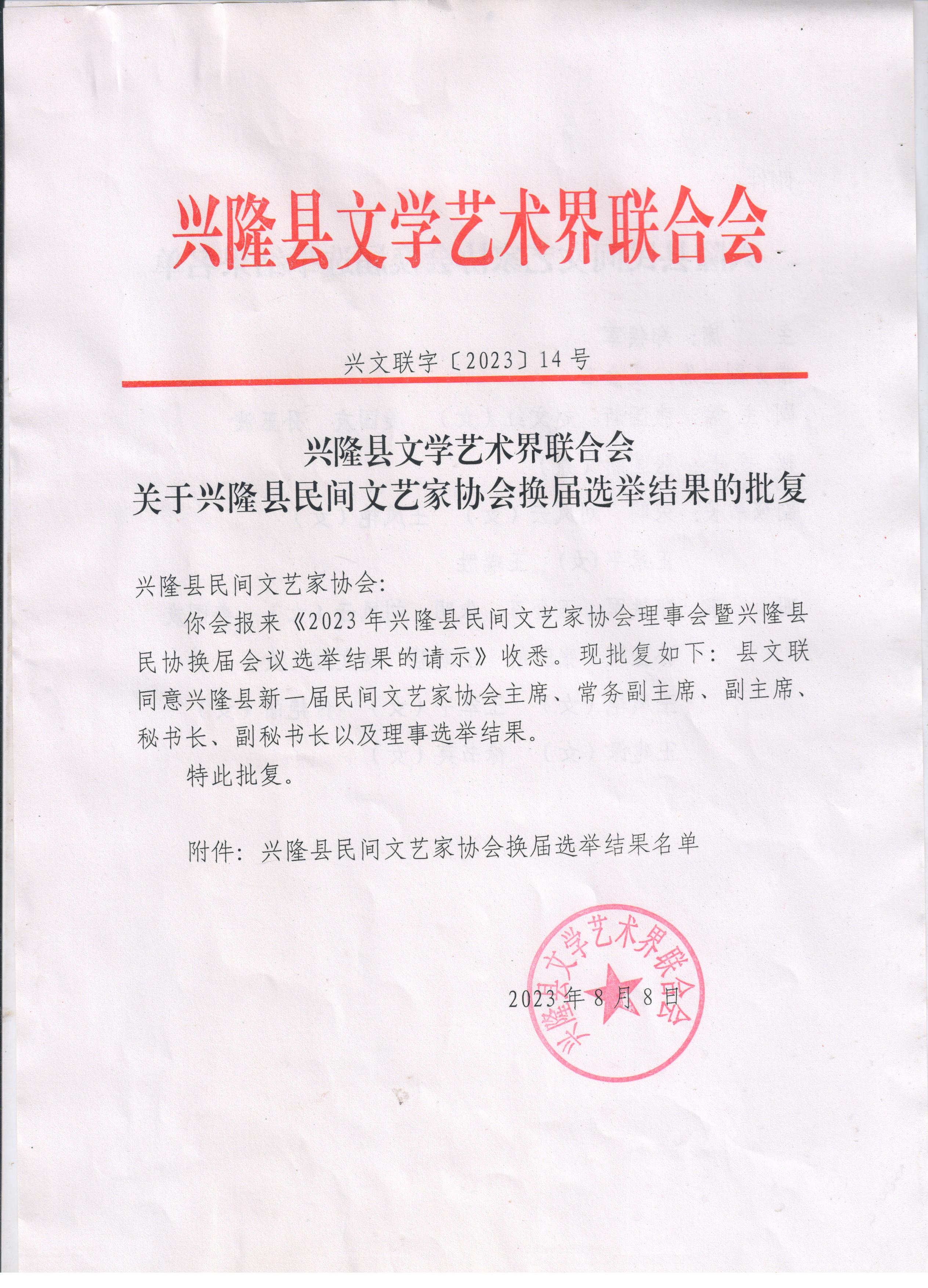 2023年8月8日,兴隆县民间文艺家协会(简称兴隆县民协)提交的《2023年兴隆县民家文艺家协会理事会暨兴隆县民协换届会议选举结果的的请示》获兴隆县文学艺术家联合会批复,兴隆县民协组织机构成员的批复如下: