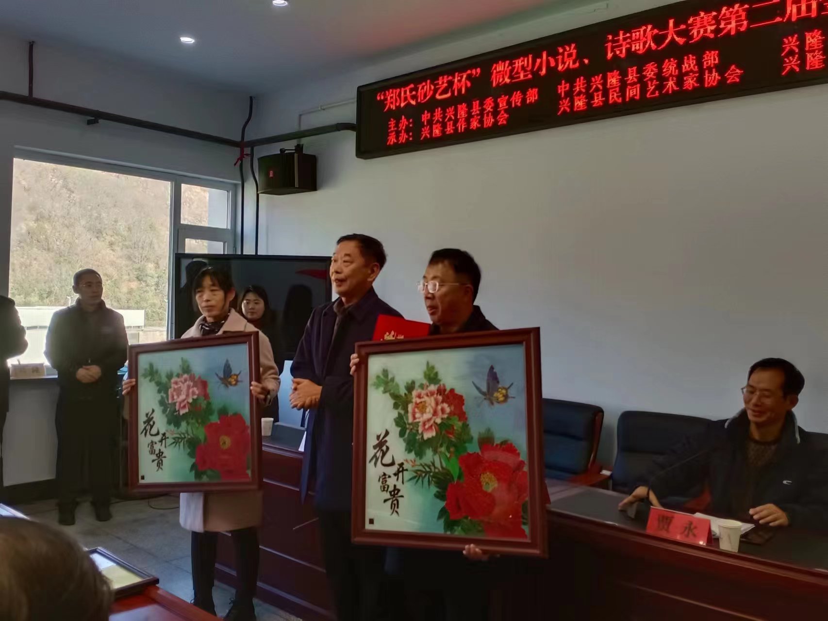 贾永主席讲述了此次大赛创作的核心价值观和文艺创新精神,并宣读了获奖名单,据悉,从4月10日开始,到6月20日截稿,共收到有效参赛稿件328件,从中初选出55人作品,由主办单位聘请评委进行复评。最终,孙玉波的微型小说《一起读圆月》、李清洁的诗歌《砂艺》分获微型小说、诗歌一等奖,陈德君的《郑氏砂画轶事》、李海燕的《绝艺》、孙金生的《较量》、王利敏的《郑氏砂艺传奇》、李占梅的《万山红遍》、陆凤霞《记郑氏砂艺非遗》分获微型小说、诗歌二等奖,刘文源的《画师》、王怀忠的《巴铁奇遇》、刘小丽的《圆梦》等九篇(首)作品获三等奖,吴贺山的《微笑的小猪》等三十二篇(首)作品获优秀奖,谢铭博的《彩砂》等六篇(首)作品获新蕾奖。