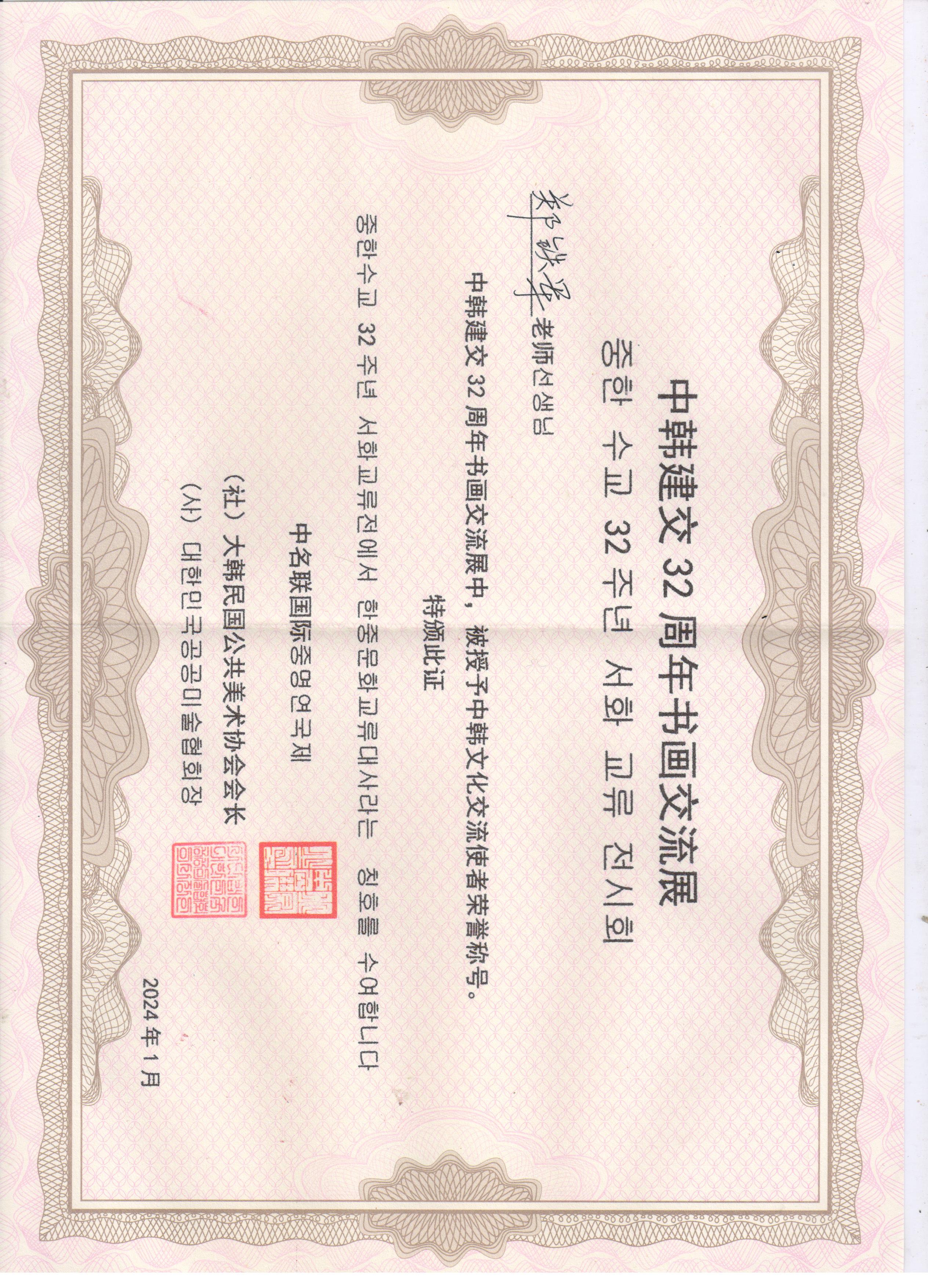 2024年1月28日,中韩建交32周年中韩艺术交流展在北京中名联国际展厅隆重召开,活动由中名联国际和大韩民国公共美术协会共同主办,主要目的是加深中韩艺术家们的友谊和文化交流,加强中韩两国人民友谊。郑氏砂艺第五代非遗传承人、中名联签约国礼艺术家郑铁军先生应邀出席了此次活动,其郑氏砂艺(画)被大韩民国公共美术协会永久收藏,并授予郑铁军“中韩文化交流使者”荣誉称号。同时,韩方表示届时将邀请中名联签约国礼艺术家赴韩国国会展览,搭建中韩深化文化艺术交流桥梁。