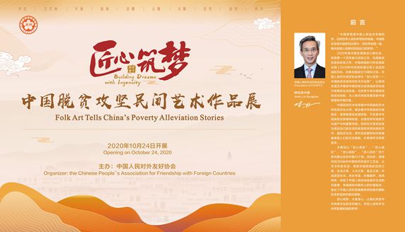 由中国人民对外友好协会主办的“匠心筑梦—中国脱贫攻坚民间艺术作品展”于10月24日(联合国日)正式开幕。中国人民对外友好协会会长林松添大使题写前言,联合国代理驻华协调员桑爱玲女士向展览发来贺词。