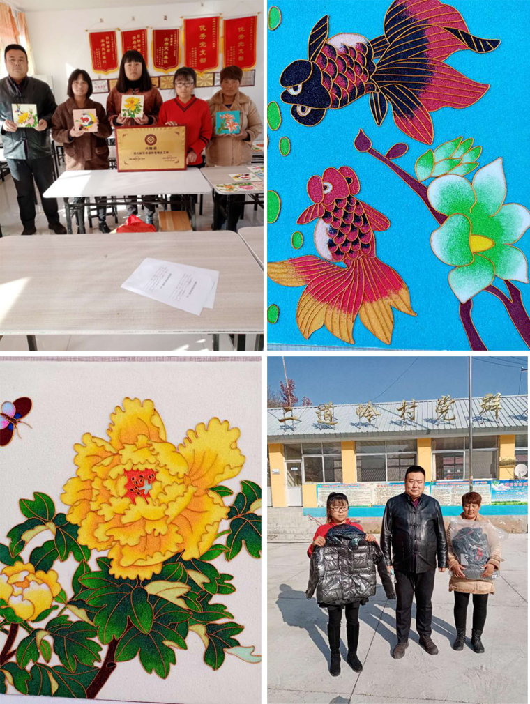 2020年11月6日。郑氏砂艺文化有限公司由郑铁军董事长带队,对蘑菇峪镇扶贫就业工坊作品开展回收工作。这次回收的作品,不仅在工艺上美轮美奂,而且在勾丝和上砂技术上,有了显著提升。通过学员刻苦钻研,精心制作,该工坊由单一生肖大轮廓向花鸟虫鱼精巧细微作品的转型。学员张秀荣、张玉红等秋收、作画两不误、两促进,使得本次回收的作品质量达到预期效果。回收作品的同时还到蘑菇峪镇二道岭小学,亲切看望了全村贫困小学生,为他们送去防寒服装。这种严寒不忘贫困学子,匠心传承大爱无疆的精神,令学生家长和广大群众肃然起敬。