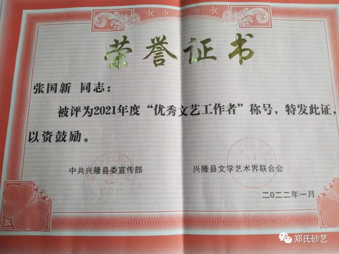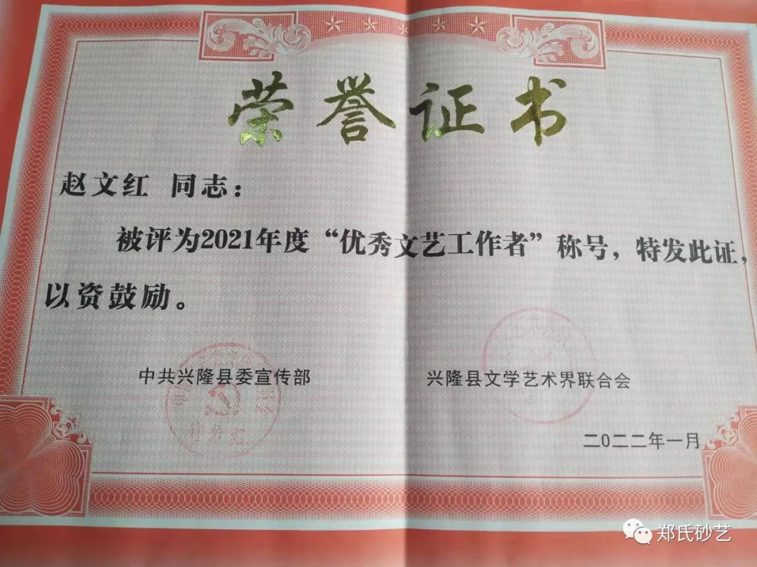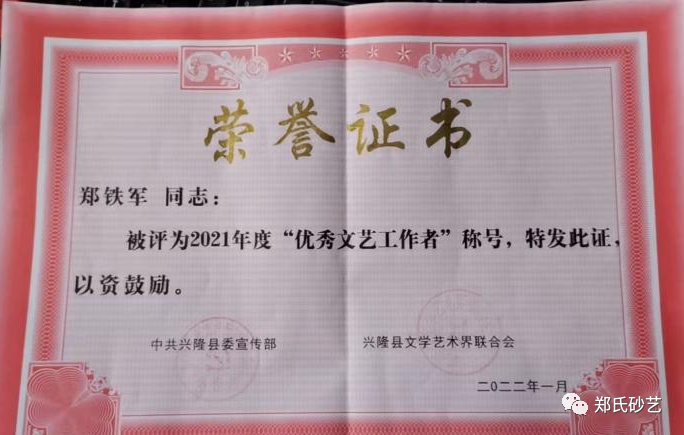 近日,县委宣传部、县文联发表了《关于表彰2021年度优秀文艺家协会、优秀村级文联、优秀企业文联、优秀文艺工作者的决定》,文中指出“2021年,在县委、县政政府的坚强领导下,在市文联的直接指导下,全县广大文艺工作者,深入学习贯彻党的十九大和习近平文艺座谈会上的讲话精神,在‘乡村振兴党旗红·文艺创新树先锋’和‘文艺名村’建设实践活动中,辛勤耕耘,积极创作,服务人民,为繁荣全县文艺事业做出了积极贡献,涌现出了一大批表现突出、成绩优异的文艺工作者。”在此次通报表彰中,郑氏砂艺董事长郑铁军、徐书英、王凤艳、赵文红、张国新、王建宝、张玉红、张秀荣、王婷共9人被县委宣传部和县文联授予2021年度“优秀文艺工作者”称号。企业将继续开拓创新,潜心创作,努力发掘出更多文艺人才,壮大郑氏砂艺艺术研究所,创作出更多文艺精品,为推进新时代兴隆县文艺事业繁荣发展作出新的更大贡献。