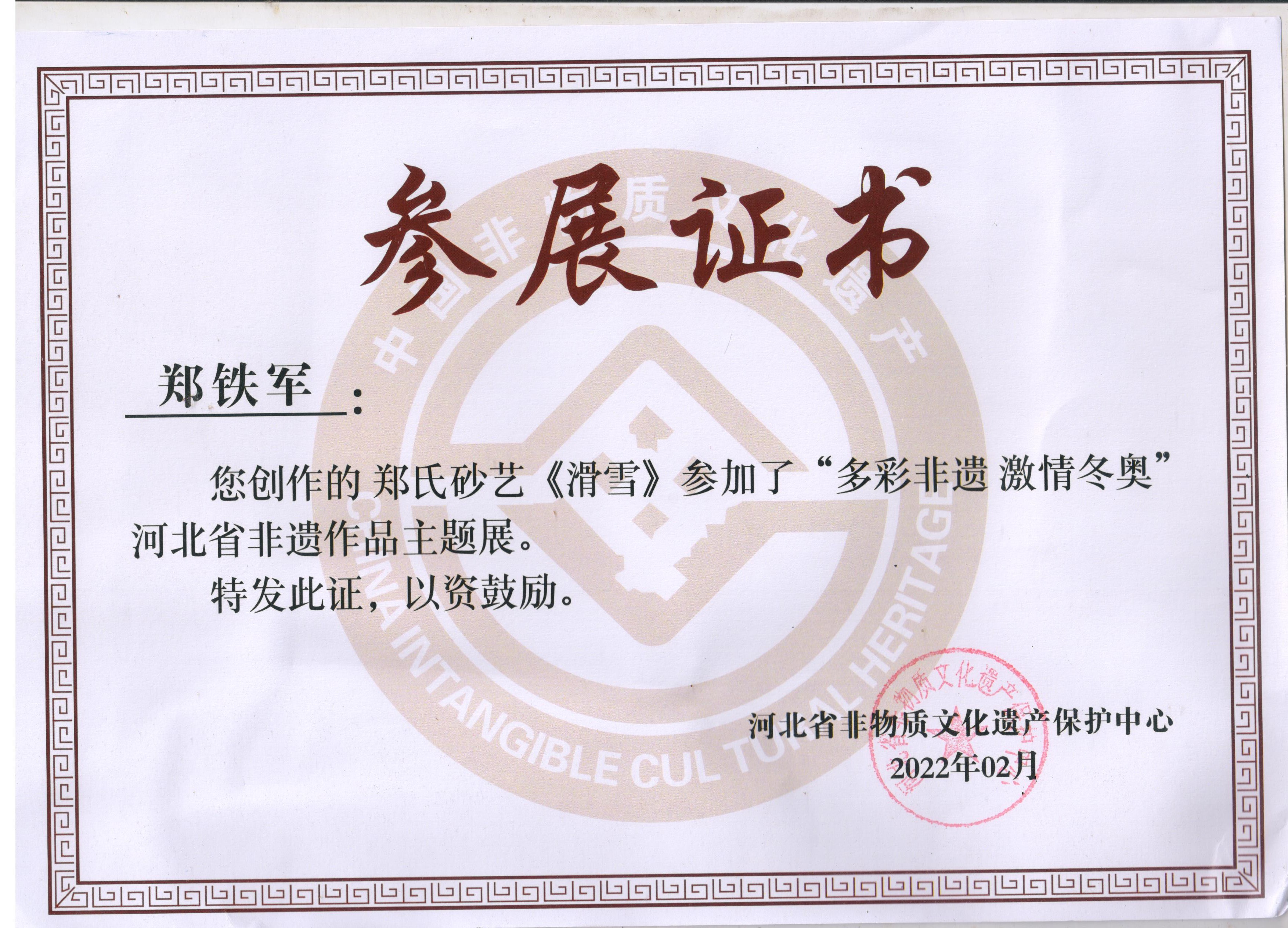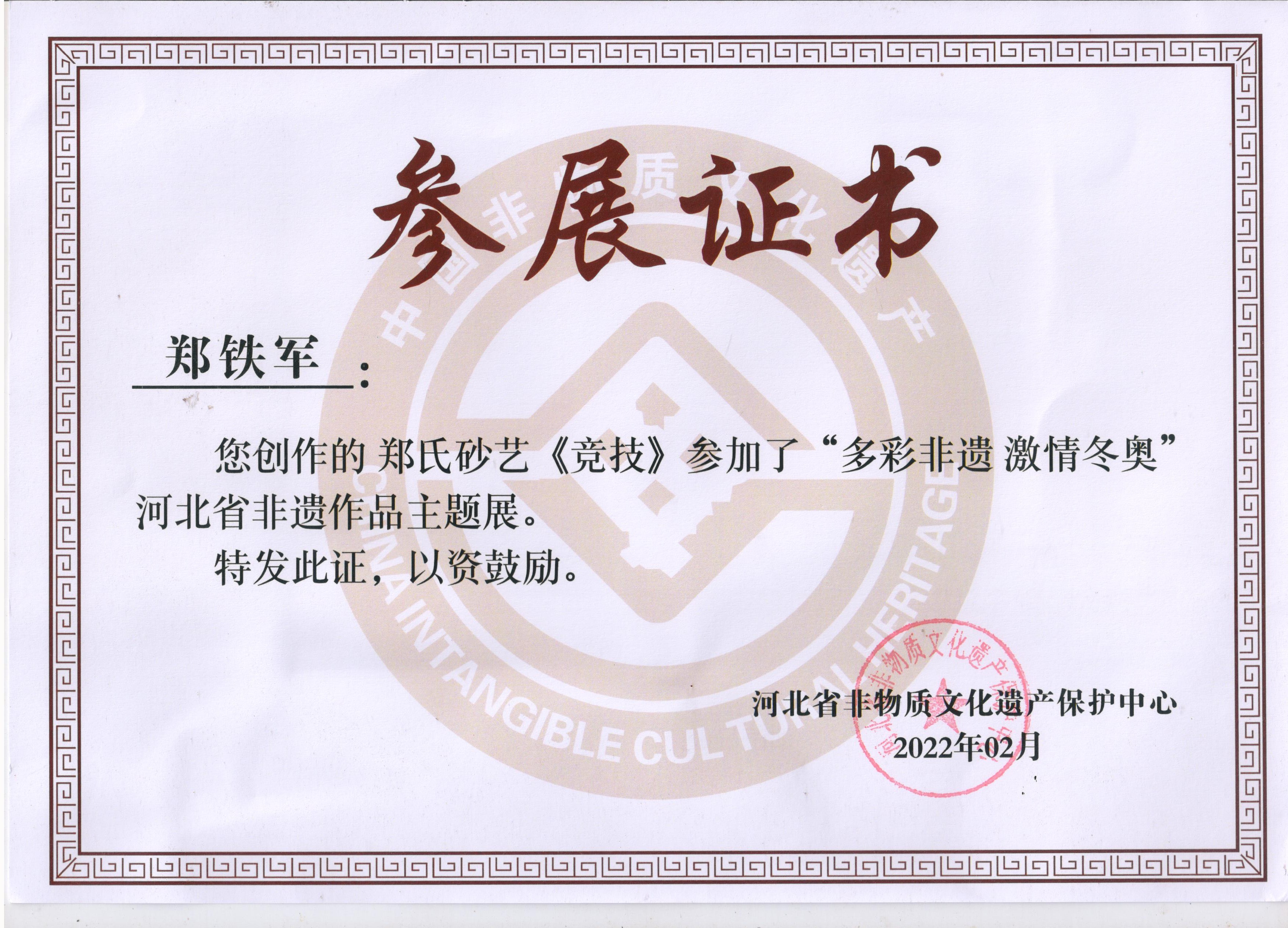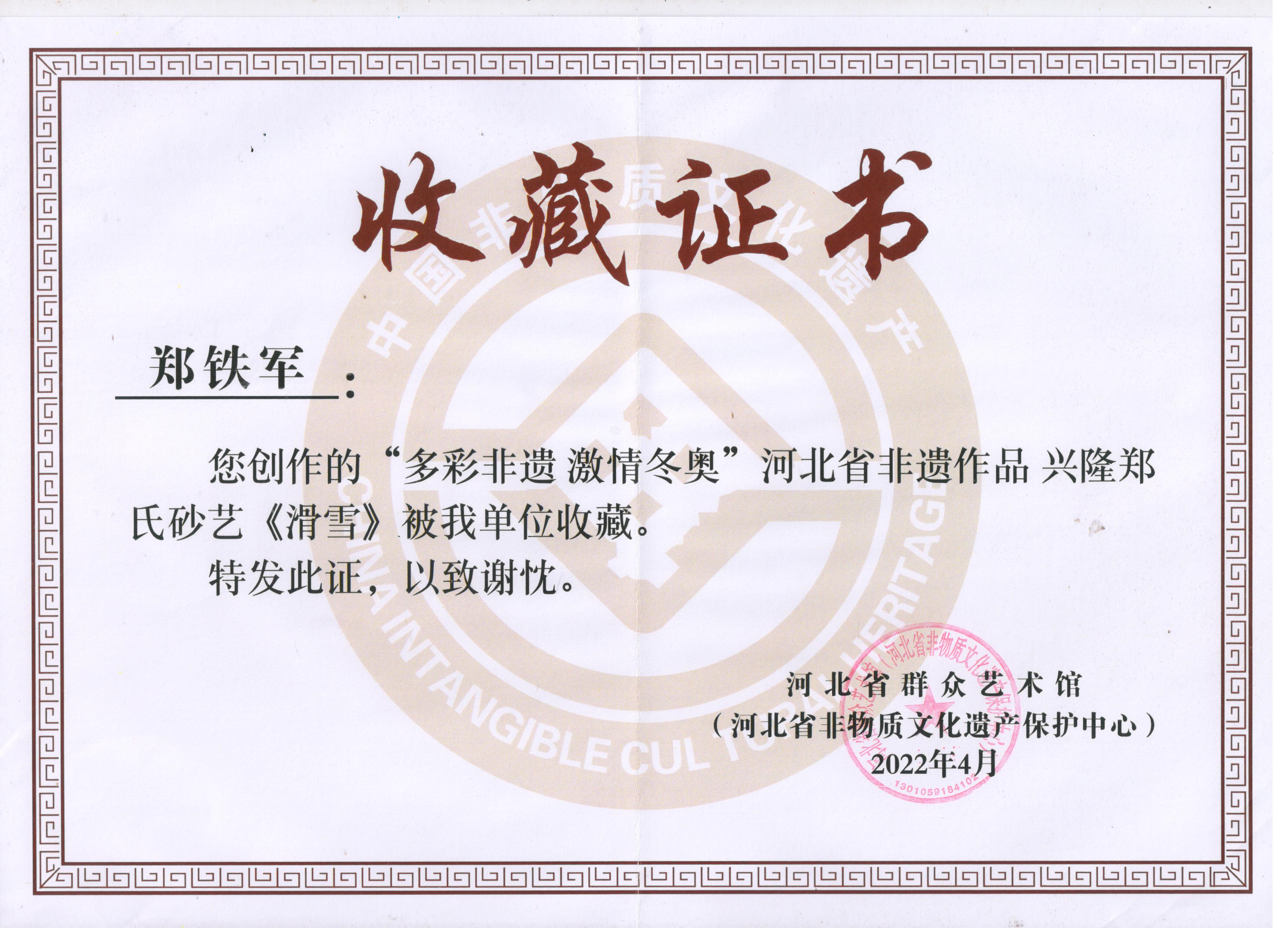 2022年北京冬奥会是我国重大历史节点的重大标志性活动,也是河北省推动京津冀协同发展、雄安新区规划建设、冬奥会筹办“三件大事”之一。因此省群众艺术馆(省非遗保护中心)按照河北省文化和旅游厅的部署在全省开展了“多彩非遗激情冬奥”非遗主题作品征集活动,本次作品以冬奥文化、冰雪文化、春节文化为题材,通过艺术展现冰雪运动,应邀郑氏砂艺执行董事国际工艺美术大师郑铁军创作的砂画作品《滑雪》、《竞技》两幅作品参展,并被省群众艺术馆和省非物质文化遗产保护中心永久收藏。