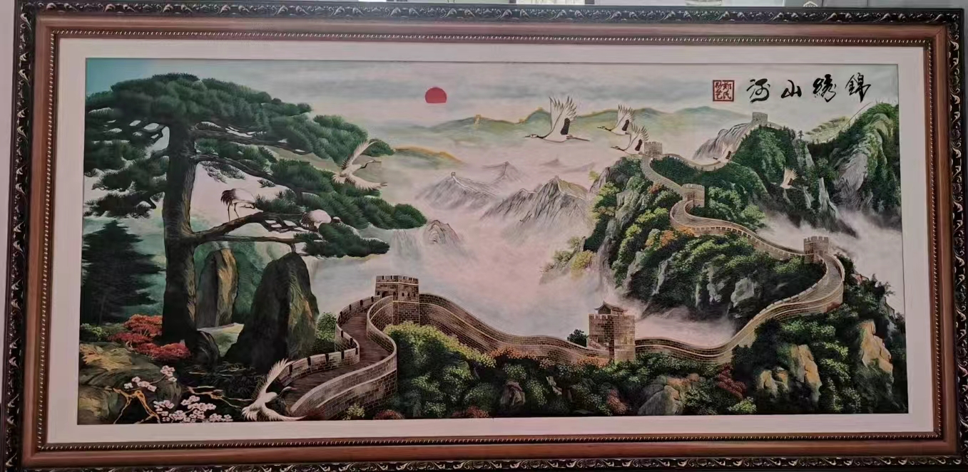 整幅画以高山、长城、云雾、旭日、大雁、迎客松以及巧妙的画技呈现了祖国大好河山的壮丽景色。,画中山情水势,脉落分明,虚实并举,映带盘旋,具有"神而不尽"的诗情画意。所以这幅《锦绣山河》是会议室、办公室和居家装饰的最佳装饰品!是镇宅纳财之灵宝,具有极高的观赏和收藏多重价值!