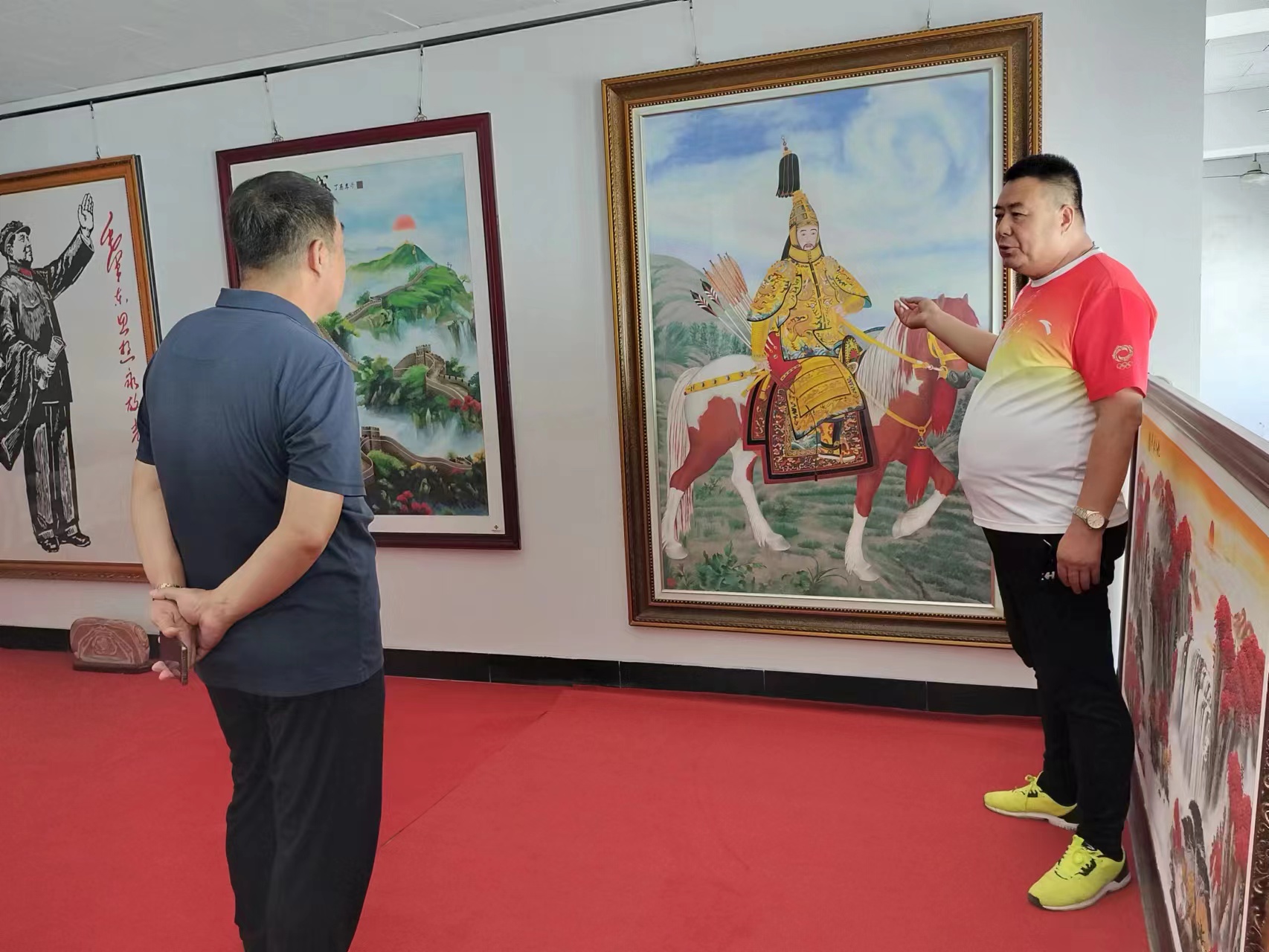 王智慧经理等人在郑总的陪同下参观了砂画制作车间和郑氏砂艺非遗文化展馆,参观过程中,郑总对郑氏砂艺(画)的发展历程、制作流程、企业荣誉和发展前景做了简单介绍。同时郑总就企业代表性砂画及其制作时采用的材料及背后的历史文化进行了简略描述。