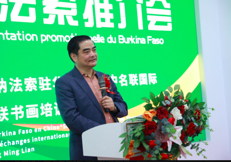 (中名联文创园图片说明:布基纳法索共和国驻华大使馆领导帕尔﹣伊萨﹣约瑟夫先生上台演讲,明确表示非常开心在中名联国际展厅举办布基纳法索国家推介会)