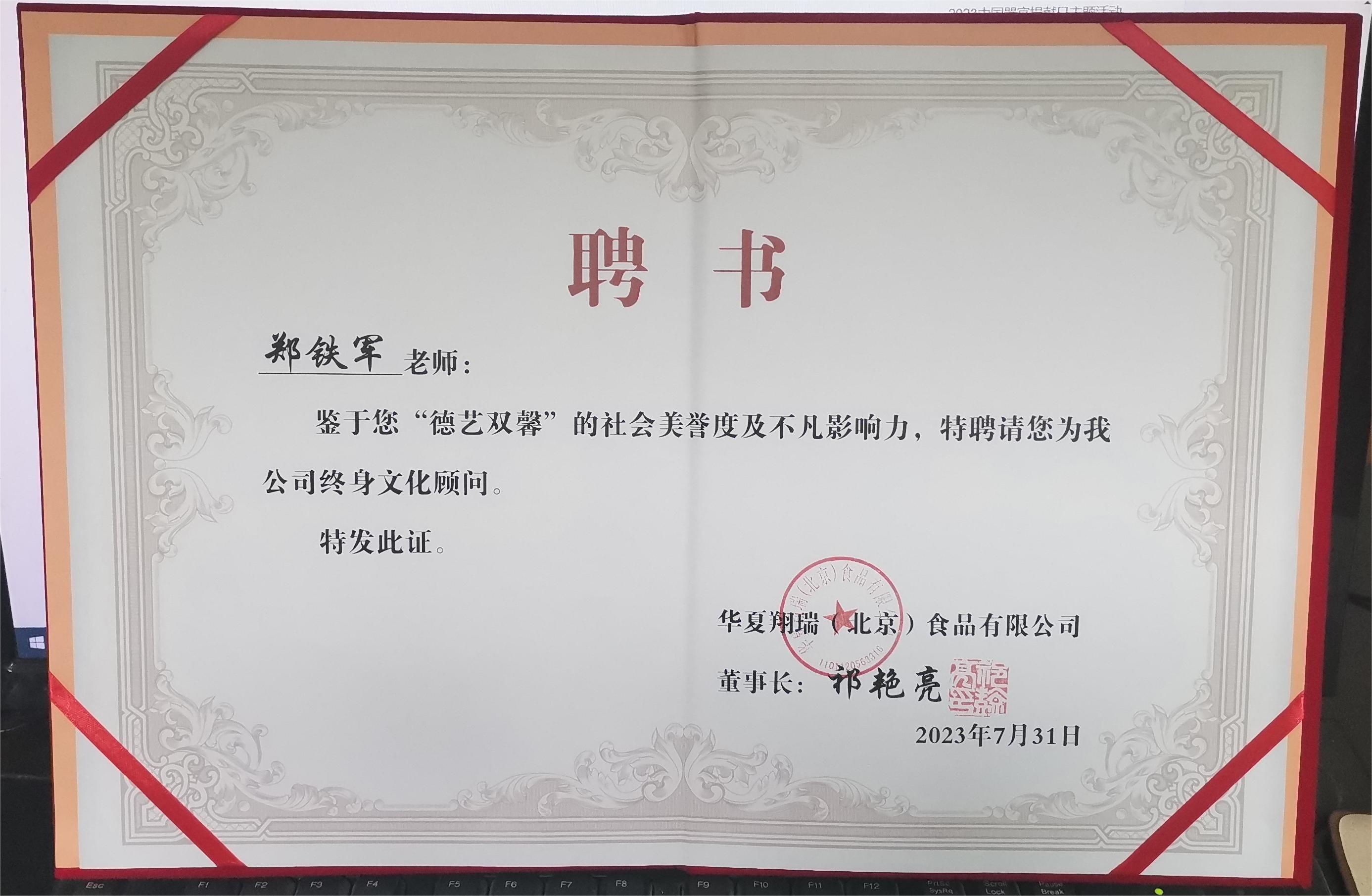 2023年7月31日,郑铁军老师砂画作品《牡丹》被华夏翔瑞(北京)食品有限公司永久收藏,同时郑铁军老师被该公司聘为终身文化顾问。