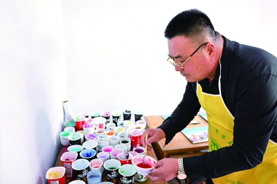 ■郑铁军调制砂画中的各色砂石原料