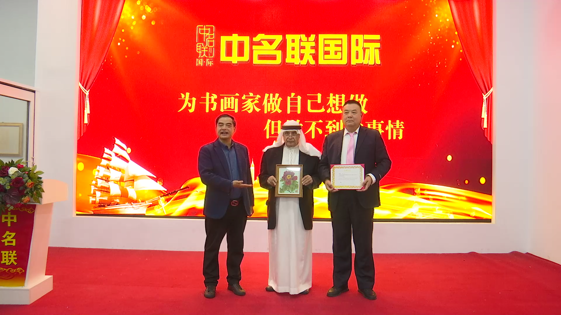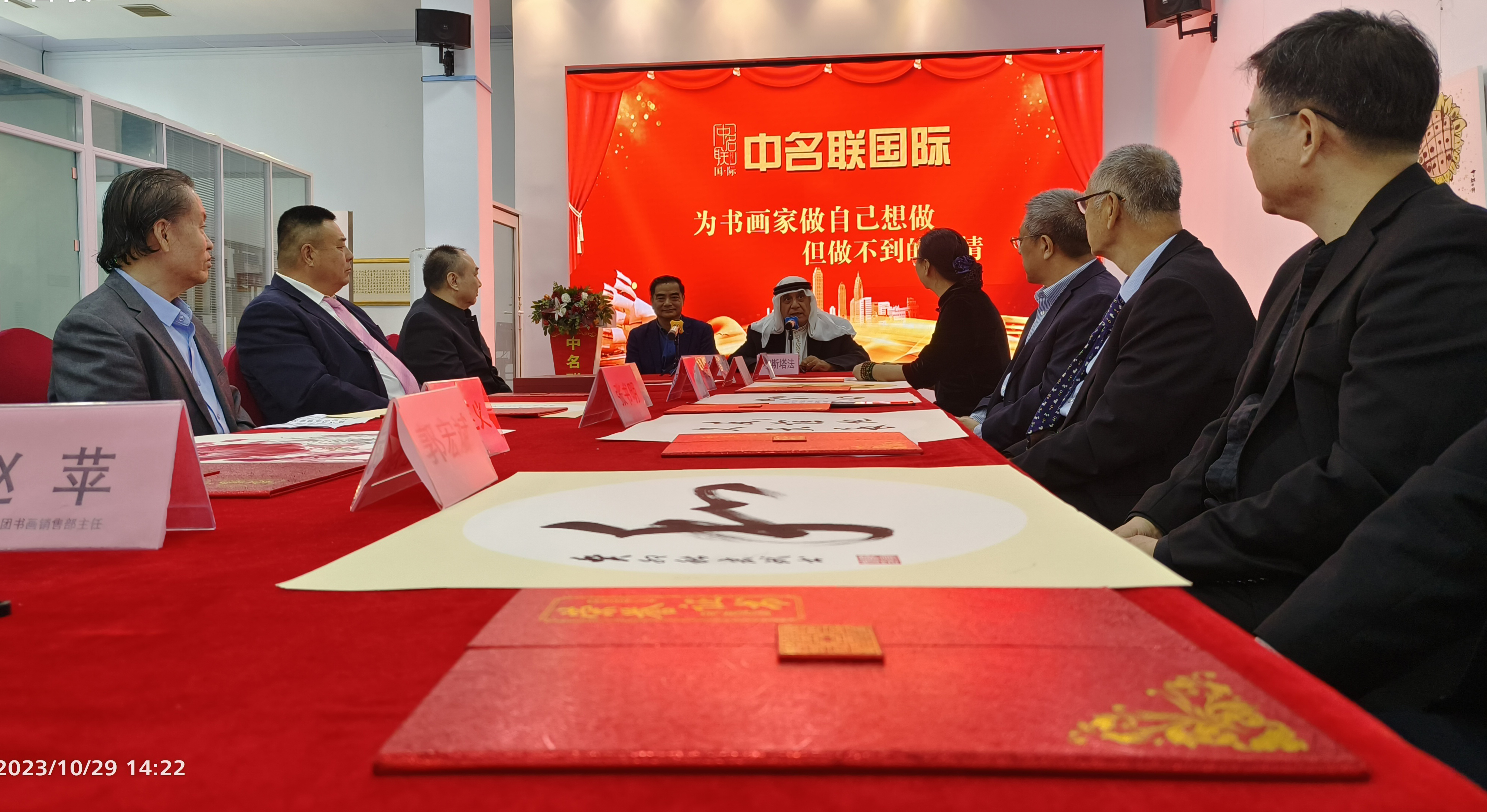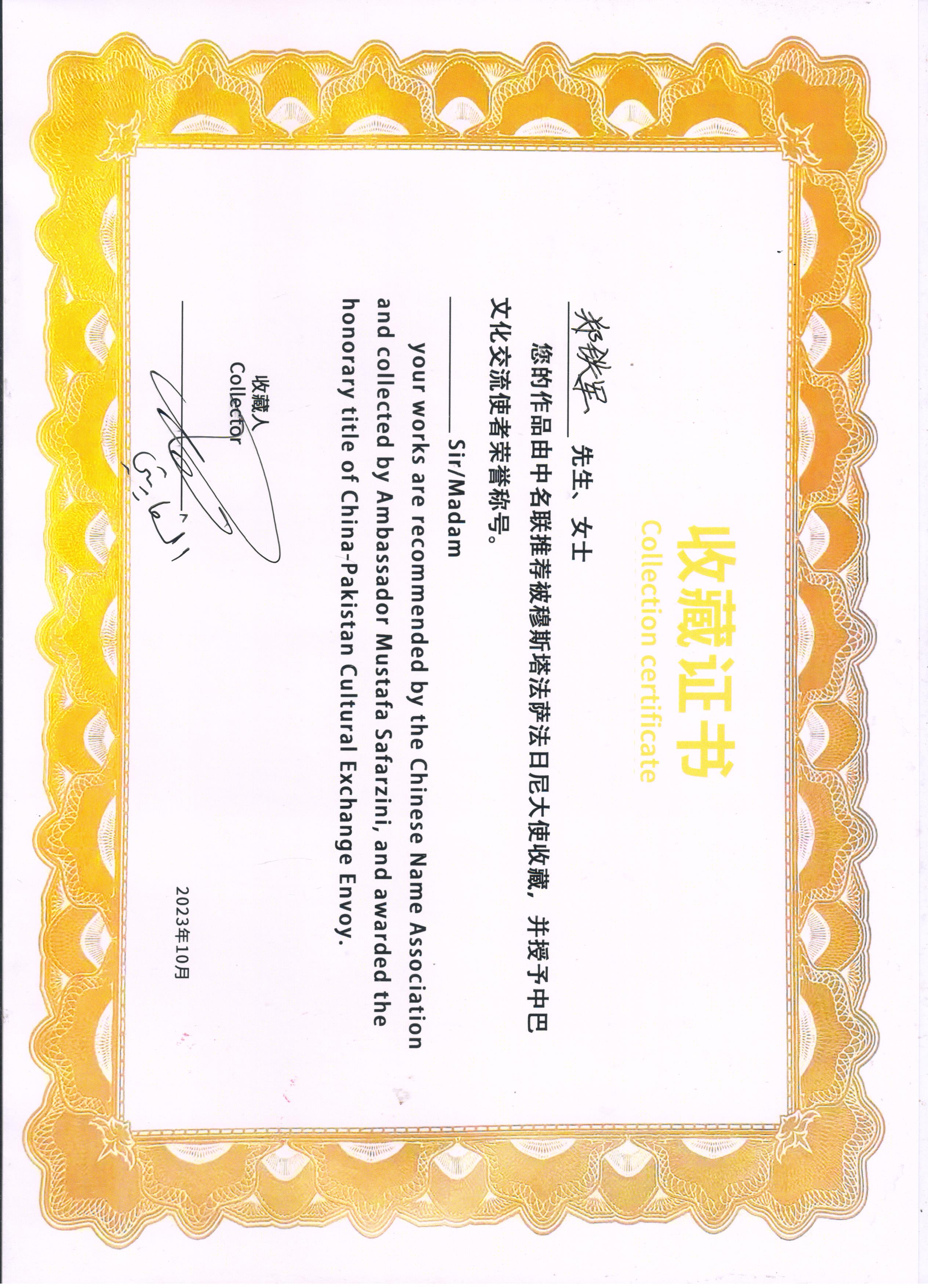 2023年10月29日,应中名联邀请,并通过中名联国际平台,郑氏砂艺执行董事长郑铁军同巴勒斯坦驻华大使穆斯塔法·萨法日尼展开了真挚而又热情的交流,大使表示十分尊重和热爱中国的传统文化,尤其是高度赞赏了郑氏砂艺(画)在艺术方面达到的深厚造诣,并将郑铁军砂画作品《牡丹》选作国礼正式收藏,同时授予郑铁军为中巴文化交流使者荣誉称号。