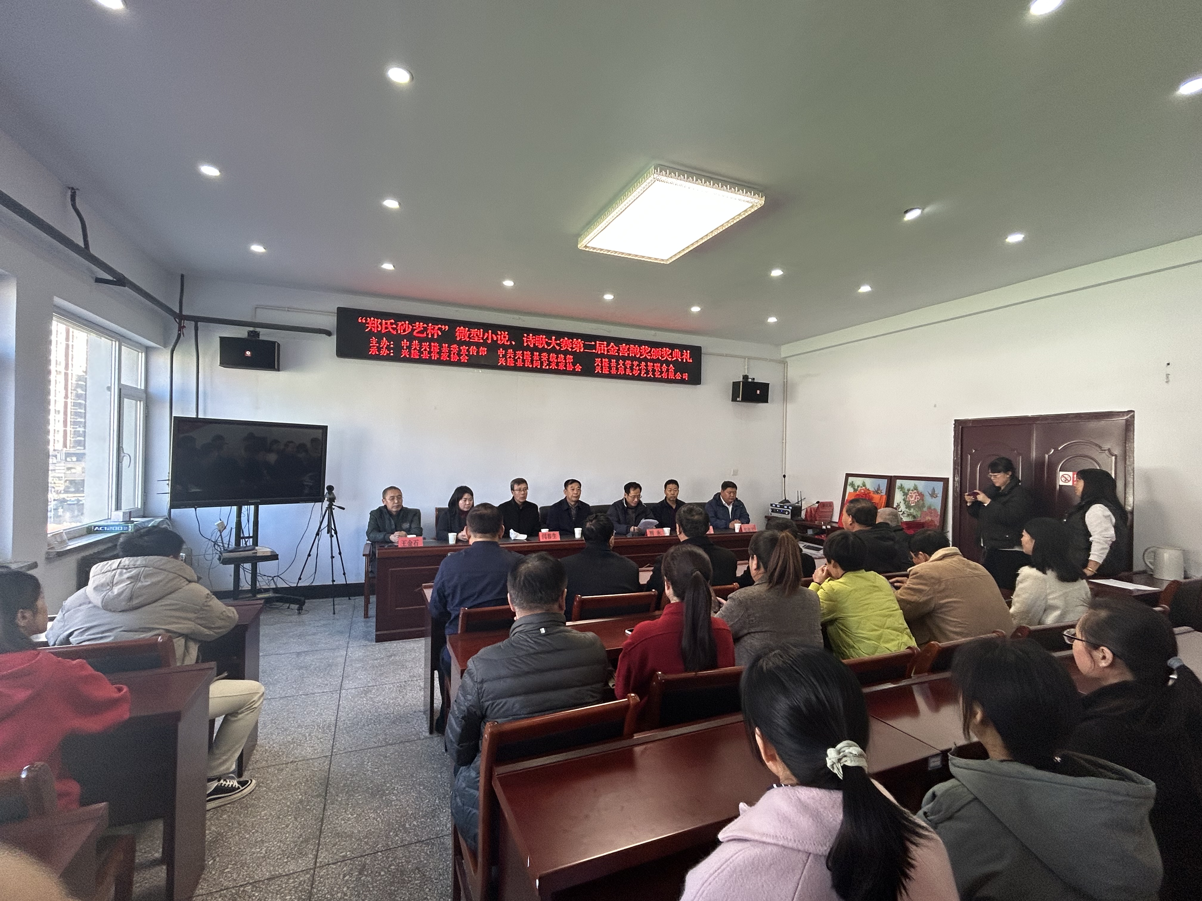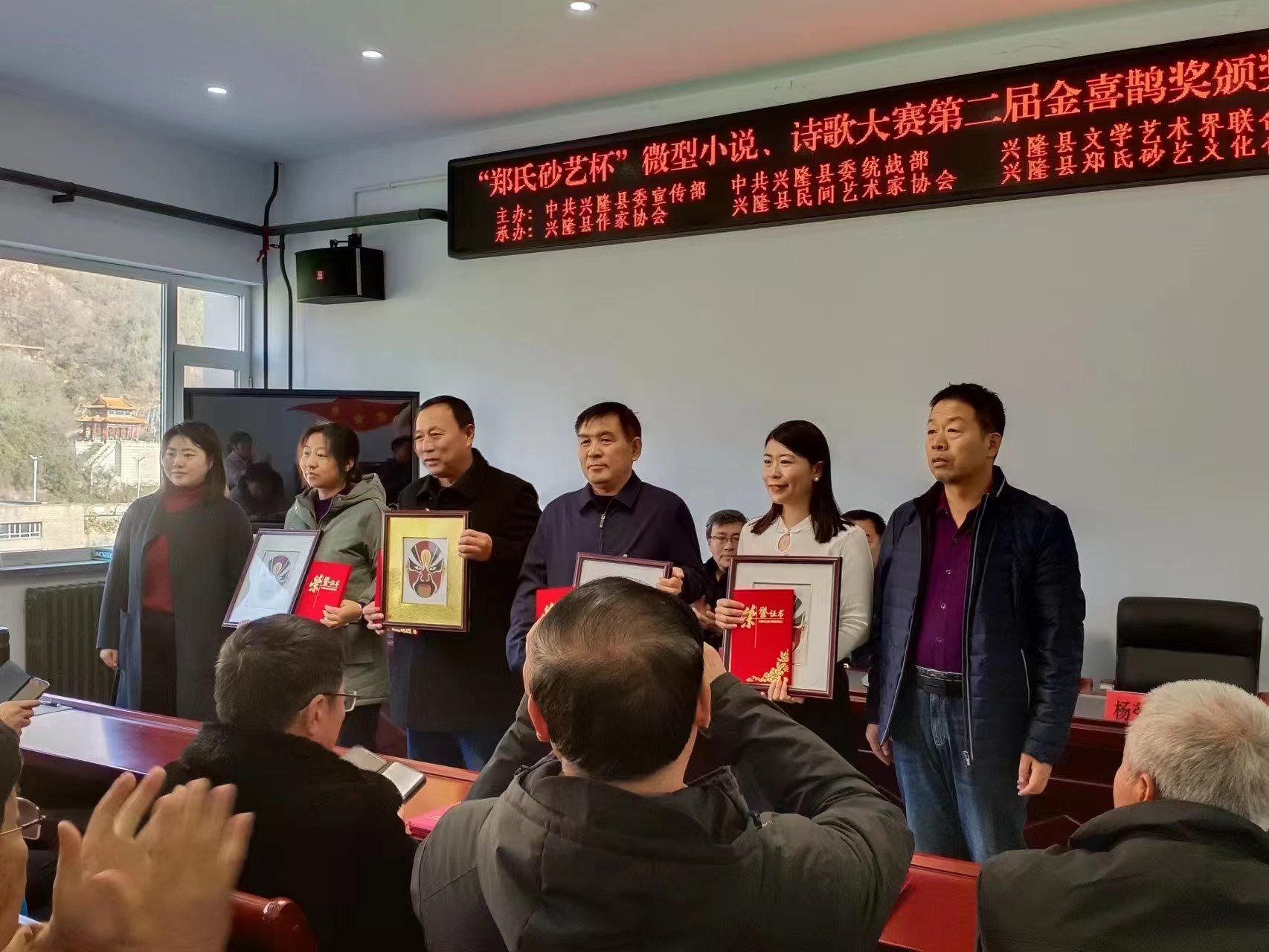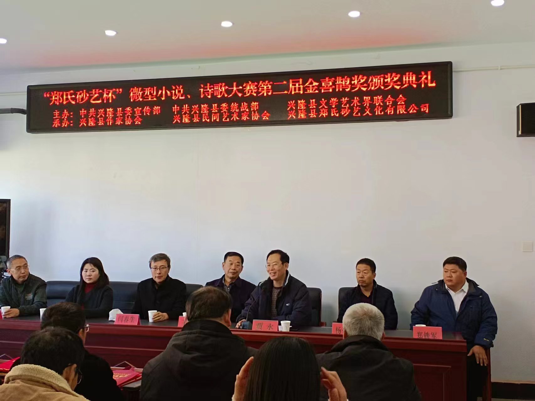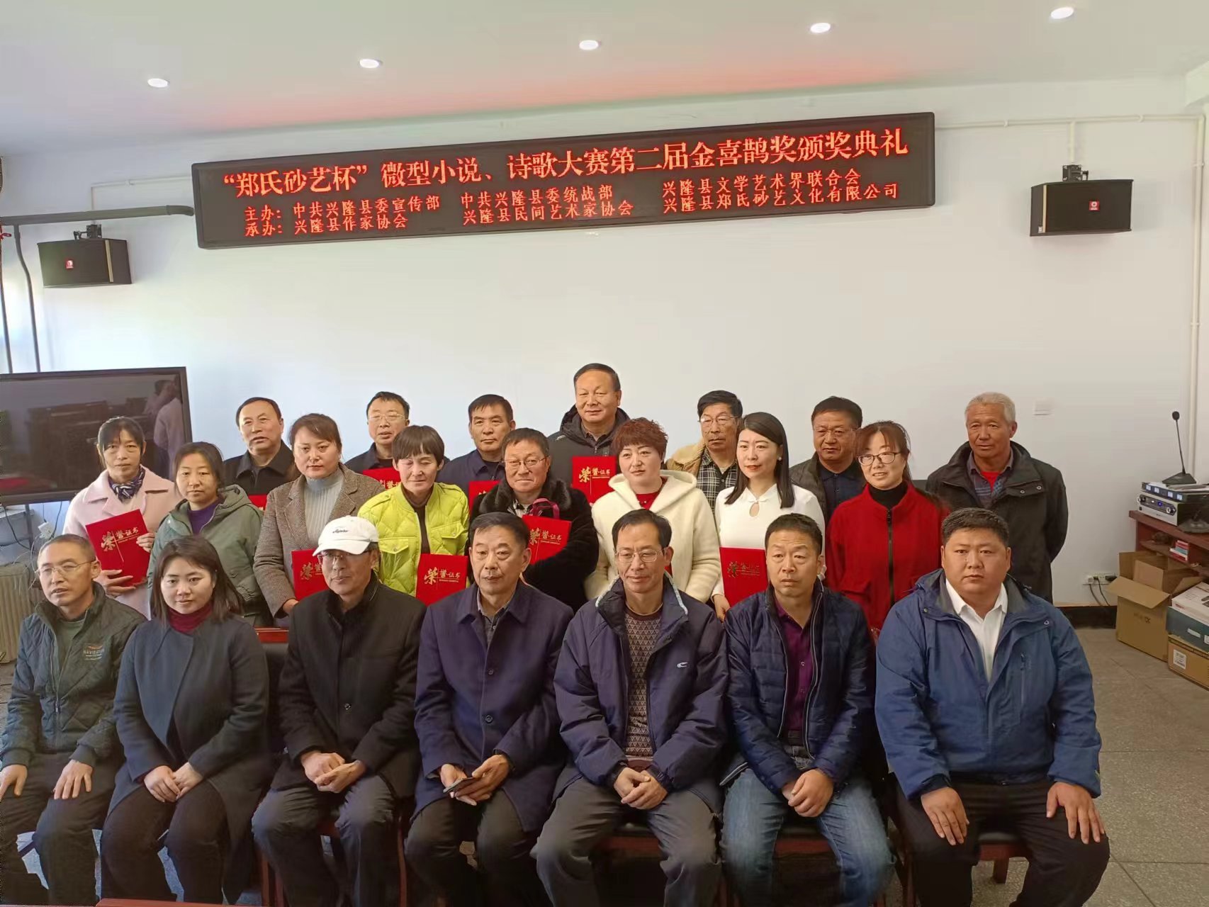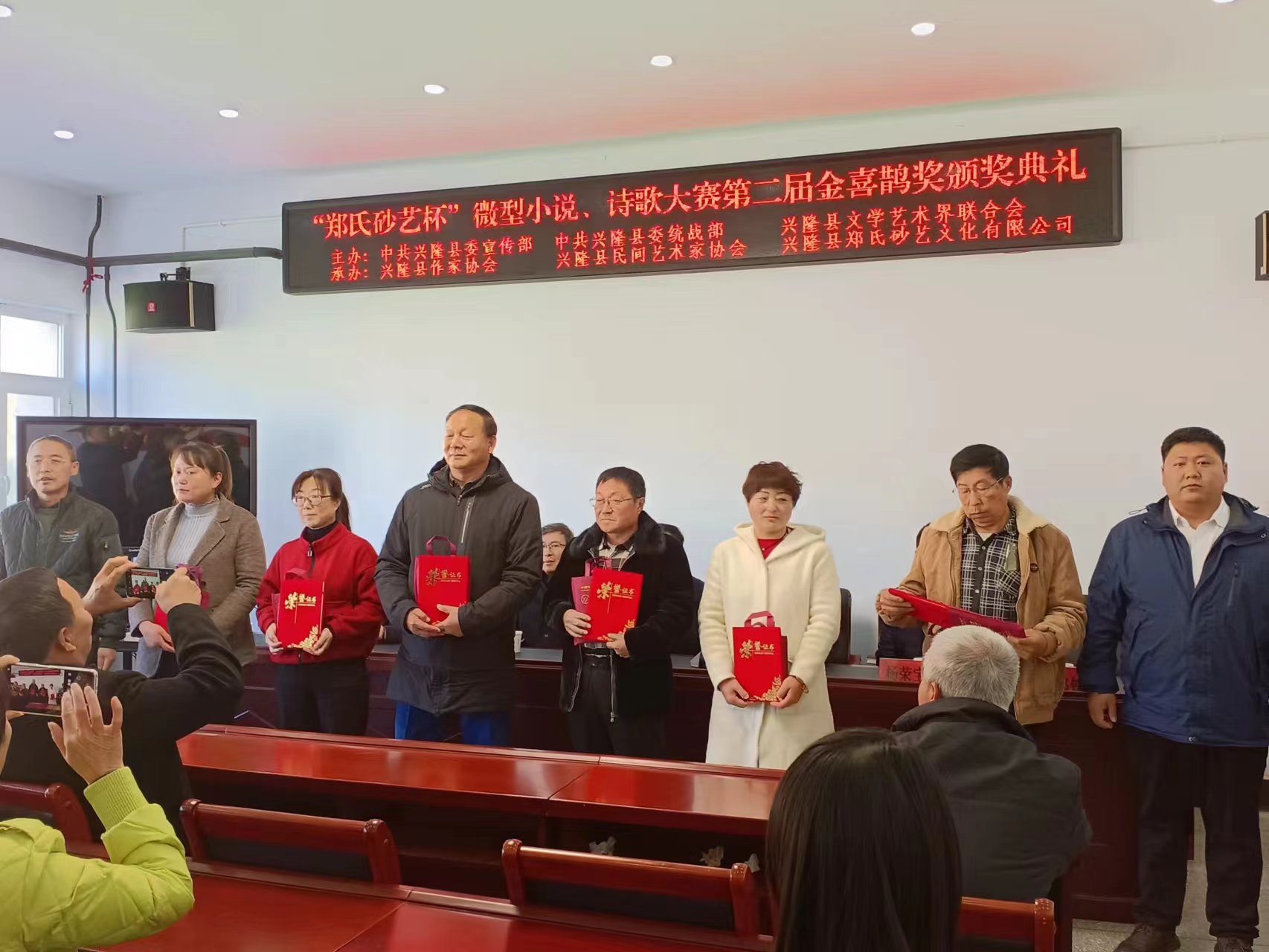 2023年11月9日上午,在兴隆县郑氏砂艺文化有限公司举办了由中共兴隆县委宣传部、中共兴隆县委统战部、兴隆县文学艺术界联合会主办,兴隆县作协、兴隆县民间艺术家协会和兴隆县郑氏砂艺文化有限公司承办的“郑氏砂艺杯”微型小说、诗歌大赛第二届金喜鹊奖颁奖典礼,出席此次颁奖典礼的主要领导有承德市作家协会主席王琦,承德市文联二级调研员闫春生,兴隆县委宣传部副部长、文明办主任温伟,兴隆县委统战部常务副部长杨荣宝,兴隆县作协主席王金石,兴隆县郑氏砂艺文化有限公司董事长、县民协主席郑铁军及“郑氏砂艺杯”微型小说、诗歌大赛获奖人员,典礼由兴隆县文学艺术界联合会主席贾永主持。