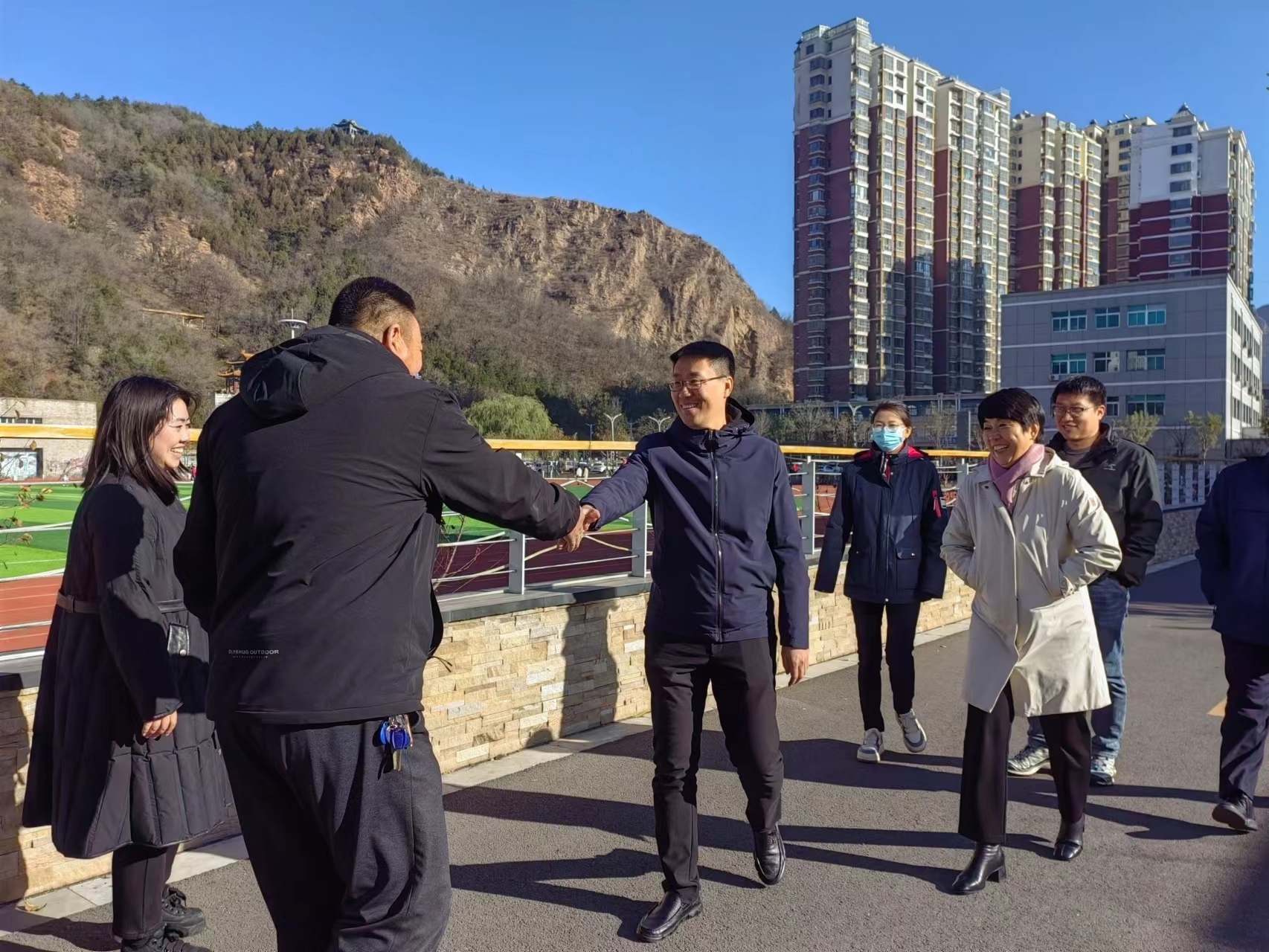 参观结束后领导们与郑铁军董事长在展厅《旭日东升》画作前合影留念。