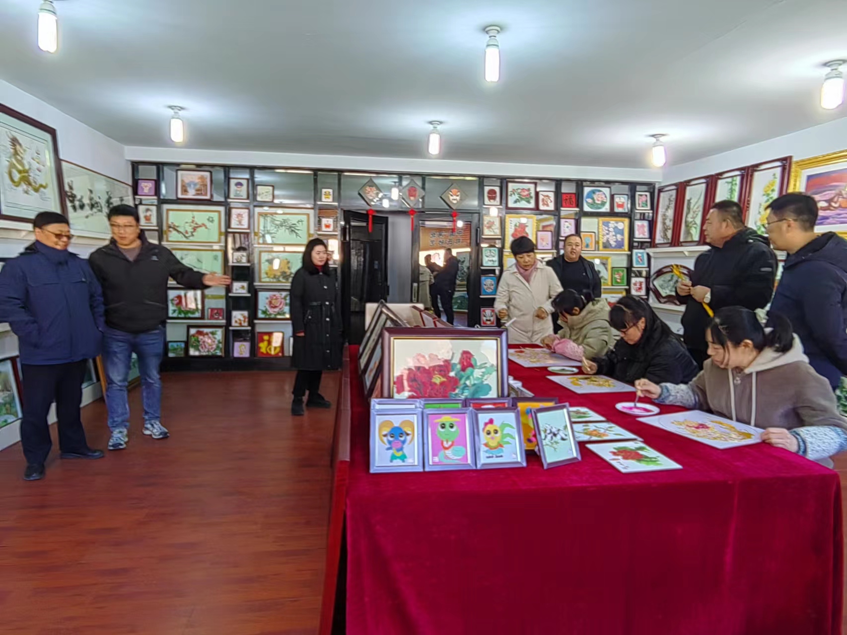 丁宇超副部长一行在郑氏砂艺董事长郑铁军的陪同下,逐一参观了郑氏砂艺展览馆和文化名家工作室,观看了技师的砂画制作手法,以及砂画主要材质和制作步骤,对郑氏砂艺传统技艺颇为惊讶和感叹,赞叹一幅幅栩栩如生的砂画作品,就是我们的画师用一双双纤纤玉手这样一点一点地制作完成的,简直是妙手回春,点砂成金。